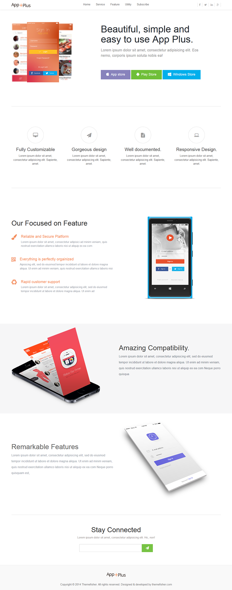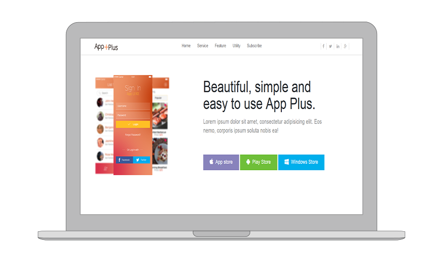 App Plus is visually aesthetic, functionally resourceful, creative, and absolutely free app landing page built with HTML5 and CSS3. The lightweight and fast loading app landing HTML template is crafted with Bootstrap 3 framework, which allows App Plus to tailor with various range of screens and mobile devices. With the smartest suitability with Ipad, Iphone, tablet, android phone, feature phone, and blackberry phone, App Plus is SEO friendly, optimized for overall conversion and free to download.