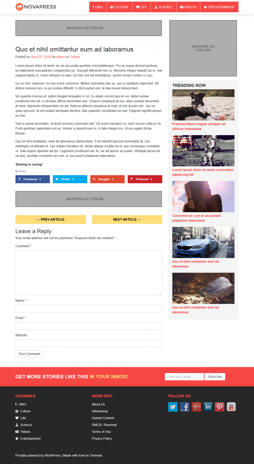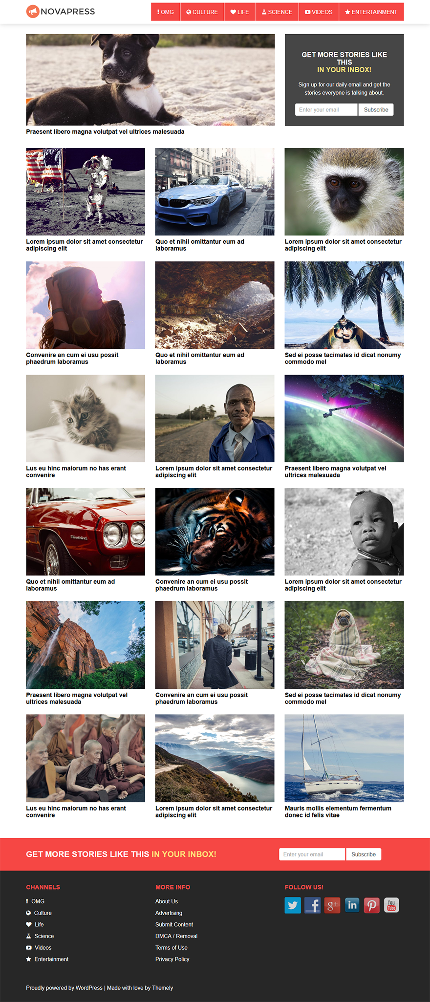Free Full Responsive Blog WordPress Theme - Novapress was special made for news site or blog. It is designed to help boost social shares and get you more viral traffic from top social media websites. It features a responsive grid layout, infinite scroll and mailchimp forms support.