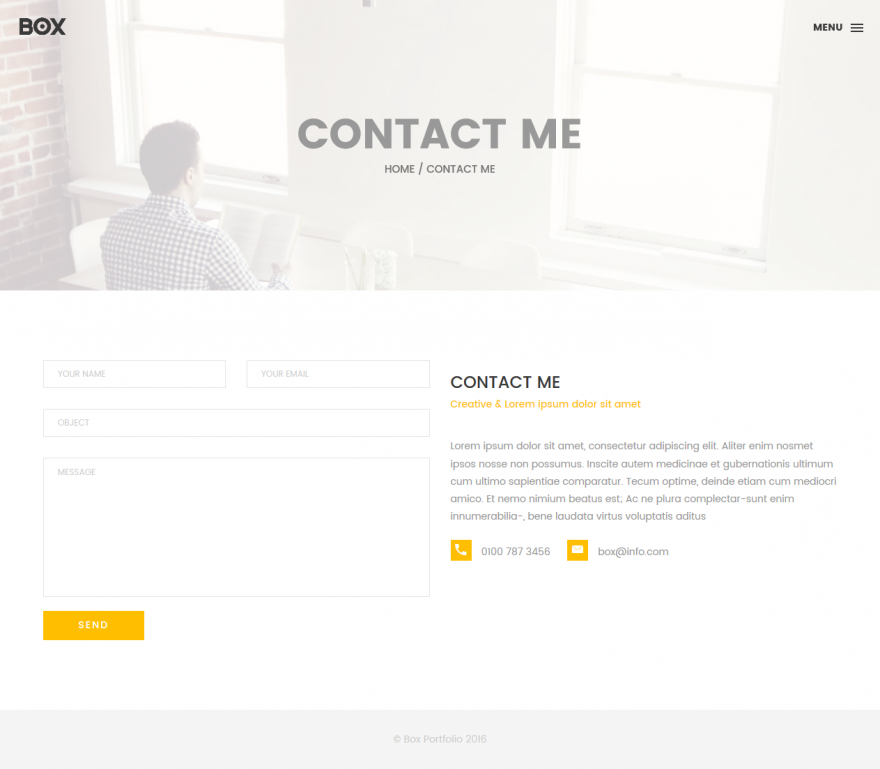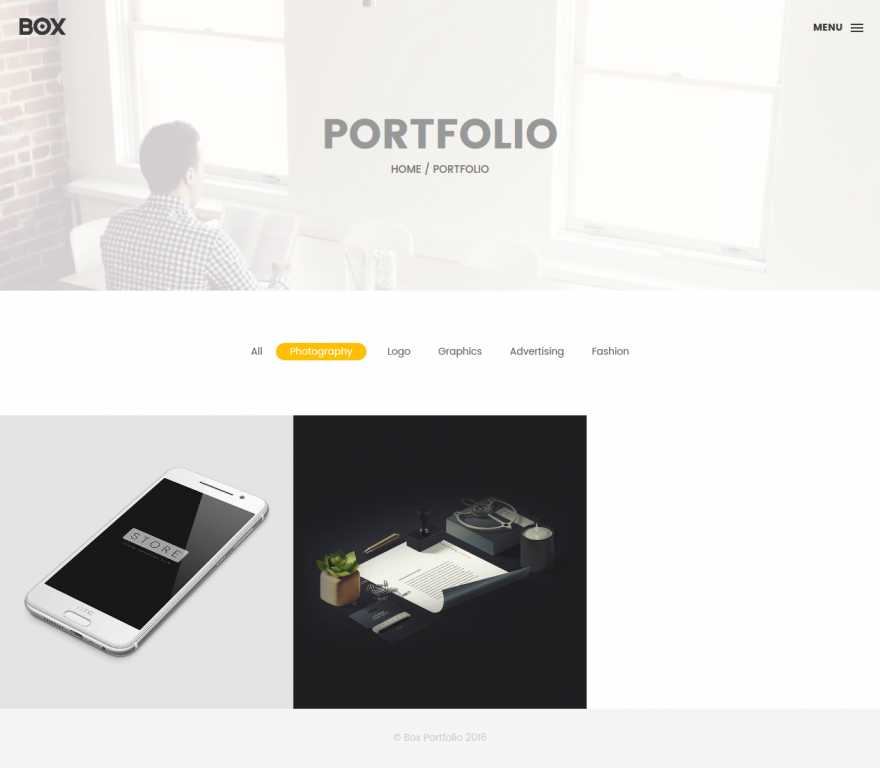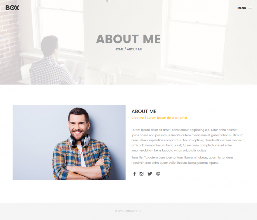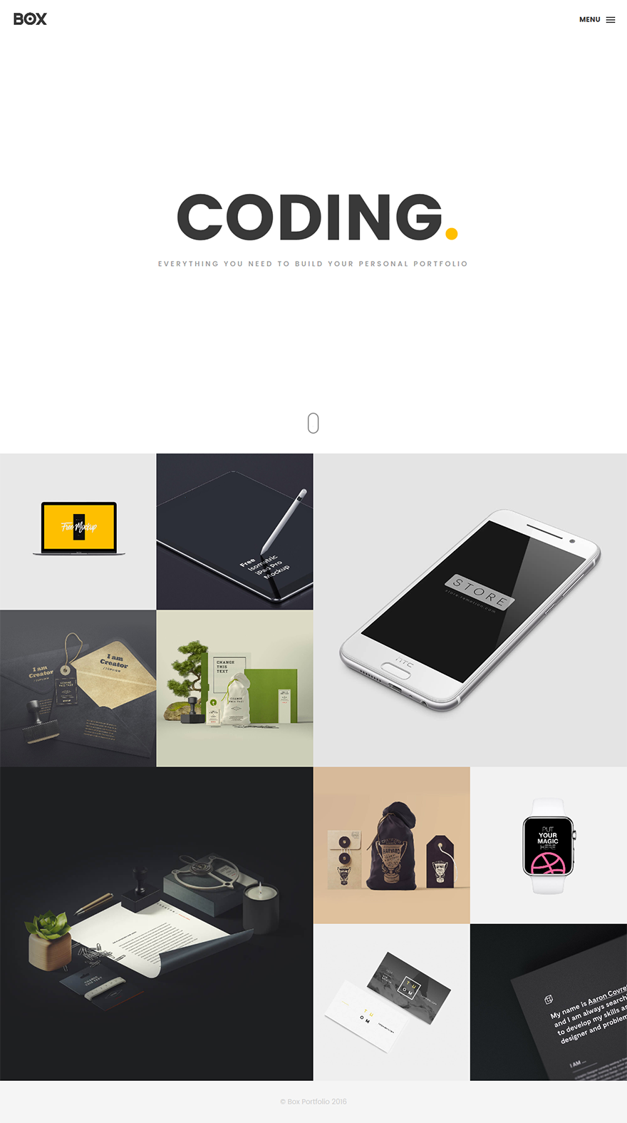 Free One Page Website HTML Template - Box is clean bootstrap portfolio template. It comes simple, easy to use, well-designed, minimalist, endlessly creative, vibrant, elegant, and sparkling layout. Box is the best free to download fit responsive bootstrap website template for creative designers, photographers, interior designer, web designer, UI/UX designer and more. The HTML5 Portfolio template is responsive and mobile friendly at core, keeping your website innovating, visually modern, deeply functional, sleek, and extraordinary.