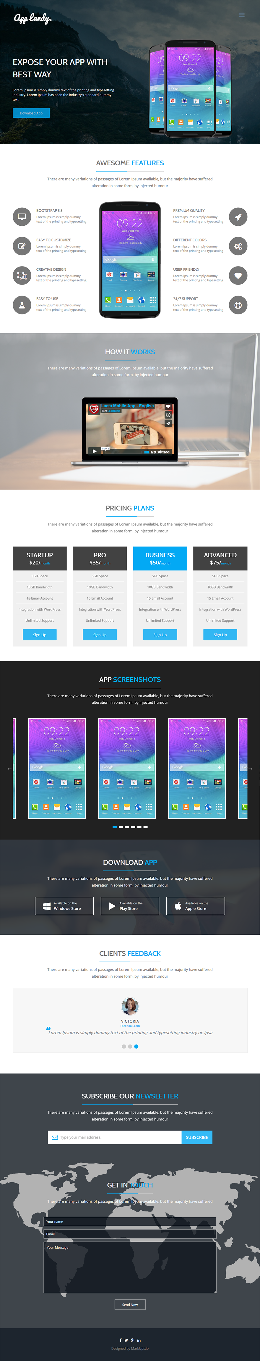 Free Mobile App Landing Page HTML Template - App Landy is a responsive & creative design app landing page template. It is well organized, easy to customize, great looking and will be perfect for product landing or mobile app landing page. Showcase or promote your app by using this free to download template with professional way. App Landy design based on twitter bootstrap and it is fully responsive. Will perfectly optimized on any kind of devices like iPhone, iPad, iMac, laptop, desktop etc. It has lots of features such as app screen section, app promotion video, app feature, pricing table, client’s feedback, app download section, subscribe newsletter, off-canvas menu, contact form, 404 error page and much more. This landing page html template is free.
