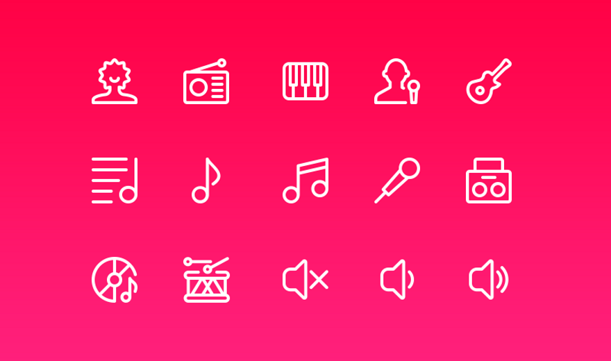 Download free vector set of simple music icons. The free set contains 15 icons, related to the music field. You can adjust any icon by controlling the thickness of the stroke. This free icon set comes in PSD and Sketch file formats. Enjoy!