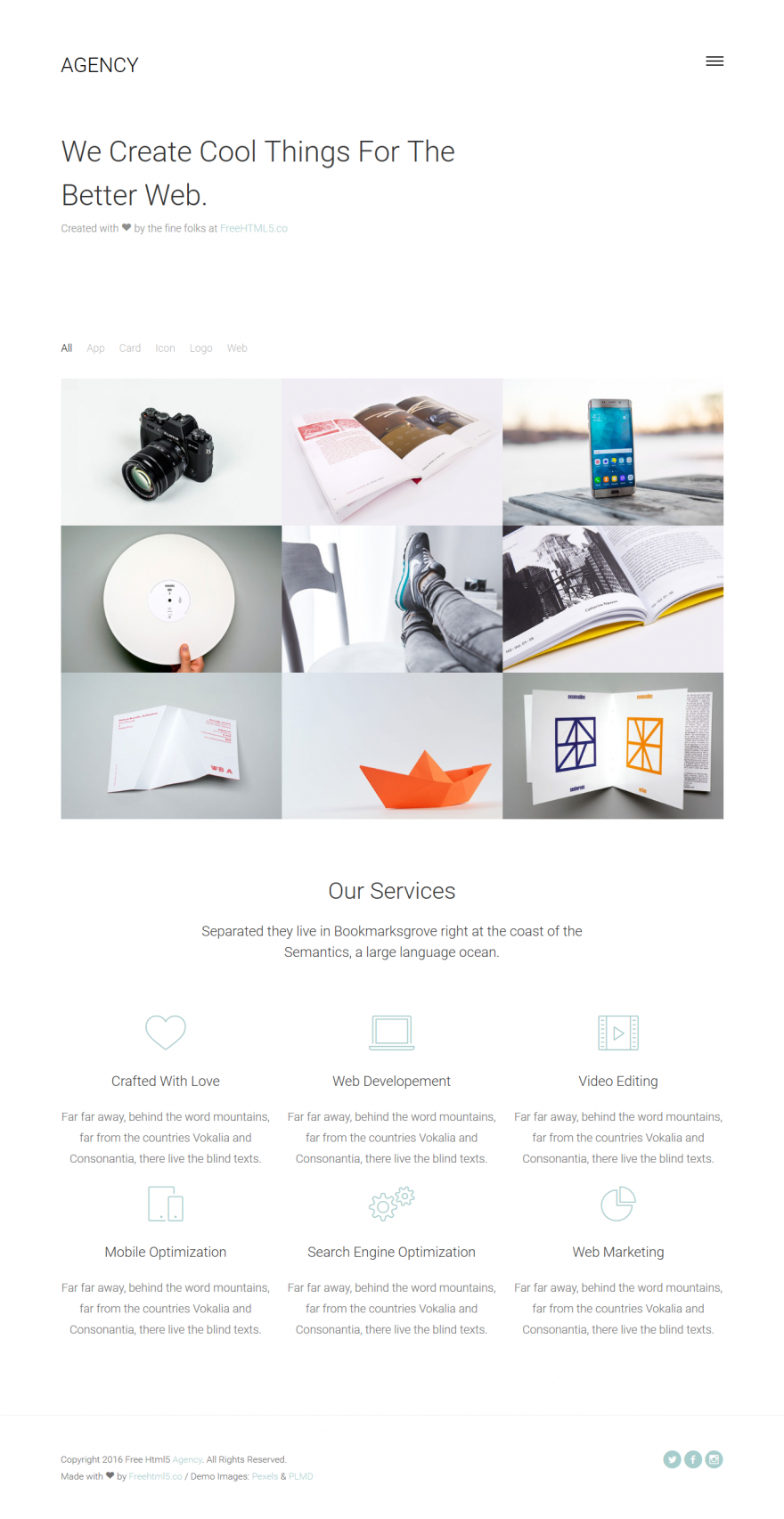Free One Page Website HTML Template - Agency is a free to download html5 website template using bootstrap 3 front-end framework. This free template is perfect for portfolio and agency websites. This free portfolio template was created using the latest technology such as Sass, jQuery, HTML5 and CSS3.