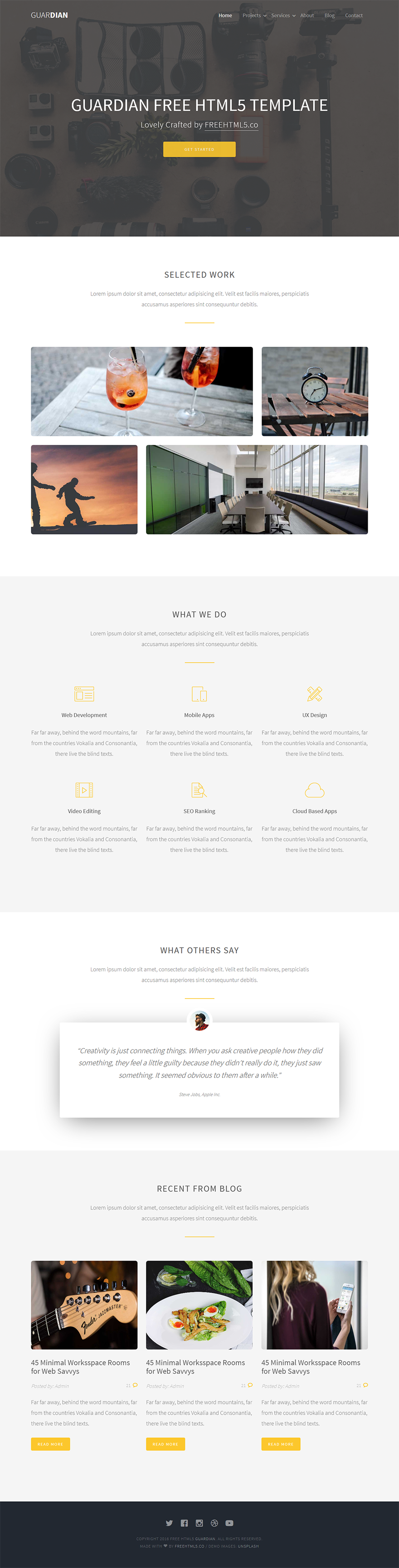 Free One Page Website HTML Template - Guardian is a free to download html5 bootstrap template. This template is a multi-purpose and ideal for any type of businesses and besides it looks great in all of devices.