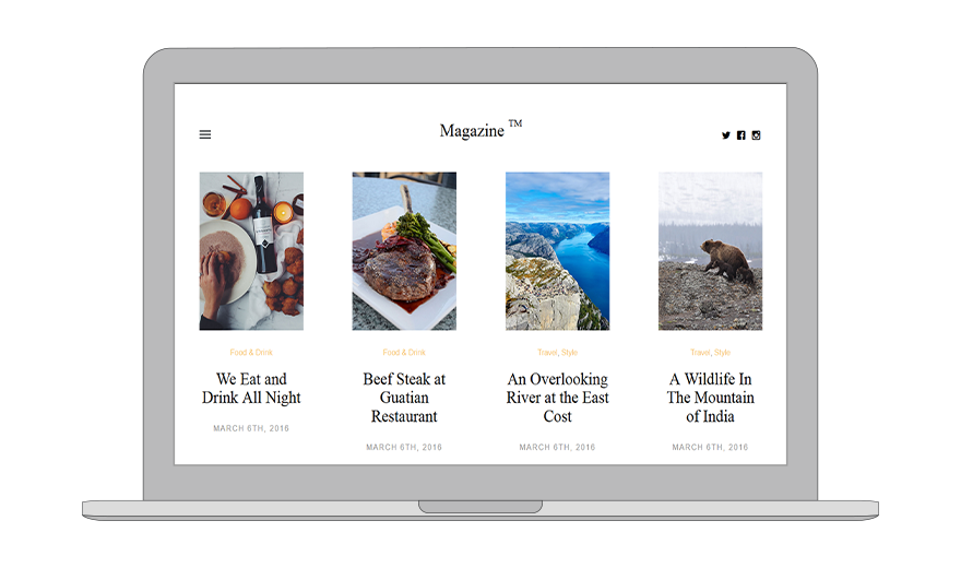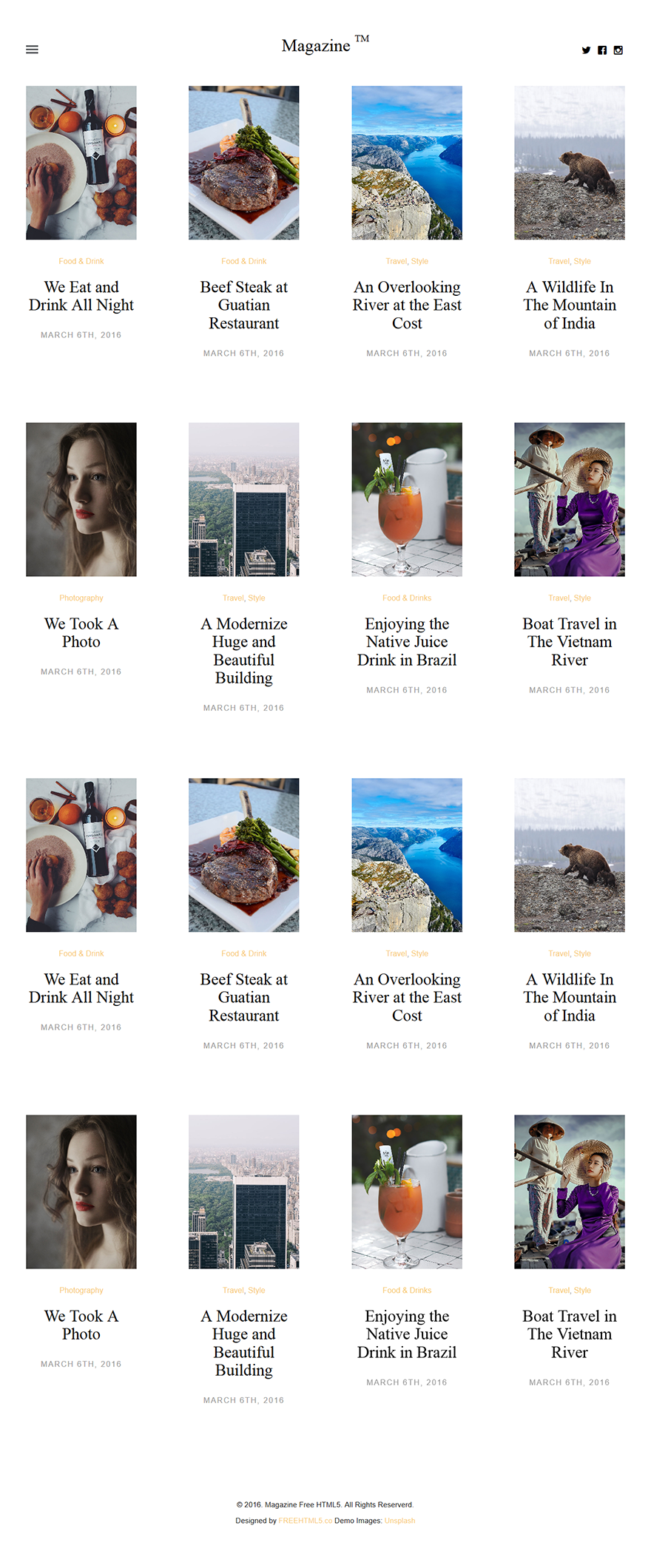 Free One Page Website HTML Template - Magazine is a clean and minimal free html5 bootstrap template. Smooth animation upon scrolling and beautiful typography make this template stand out from the rest. This is perfect free to download personal blog template .