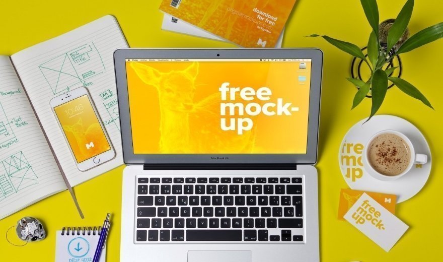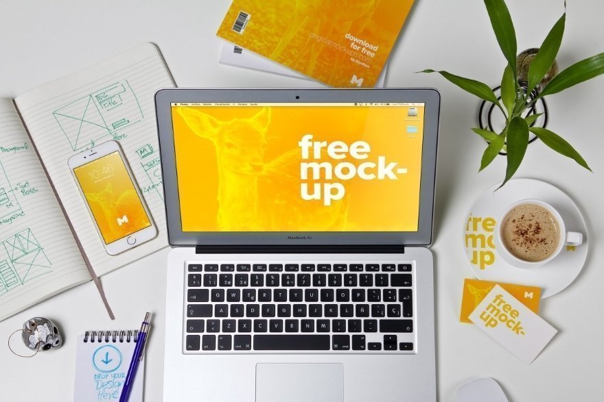 Download a free PSD mockup of the modern workspace with multiple customizable objects. This free PSD includes MacBook Air, iPhone 6, magazine cover, Moleskin, notebook, and business card mockups. The variety of the objects allows you to showcase different design projects in a modern way. You are able to adjust any of the mentioned objects in few clicks via Smart Objects feature. The reflections of this PSD mockup are optional with two variations: a classical flat gradient or a photorealistic blurry environment.