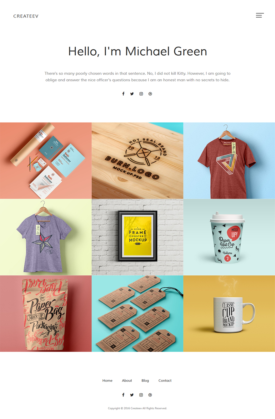 Createev is a minimalist portfolio template perfect for creatives. Built using popular Bootstrap framework with HTML5/CSS3. The template is 100% responsive and it will work correctly in every device screen.