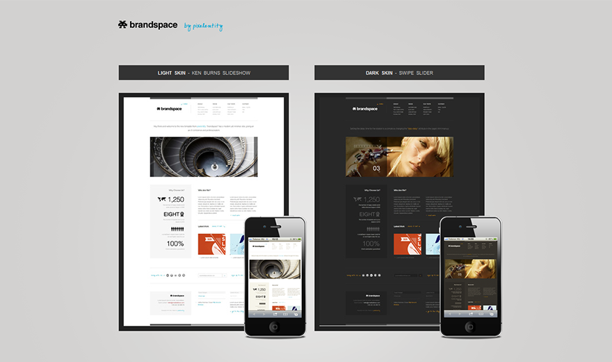Brandspace is a beautiful clean and elegant HTML/CSS template. This template has been designed to be suitable for corporate, small business or creative clients. While designing this template the aim was to create something with a well crafted visual structure, using strong lines but managing to keep a beautiful minimal appearance with lots of breathing space. In addition this good design is supported by some really strong technology behind the scenes. The bespoke homepage slider is just one example of this.