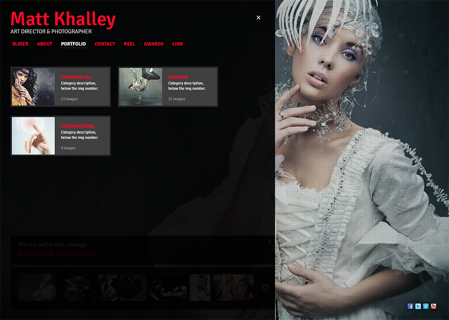 KingSize (HTML) is a great portfolio / photography template that offers fullscreen background images (slider) and videos. As well as 5 unique gallery styles to impress your visitors!