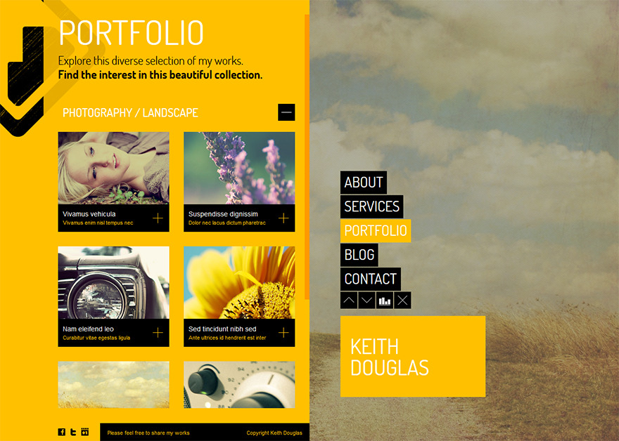 This premium collection offers you 30 best hand-picked portfolio templates. If you are Pro designer, photographer and have what to show, but don`t have enough time for developing, you can find perfect HTML portfolio template here. No need to be a web developer - every template is good documented, so you would not have problems with styling or editing info on your site. Every template has its own features - different colors, galleries, scripts for filtering, pricing tables and more. If you look for portfolio template - you are in the right place.