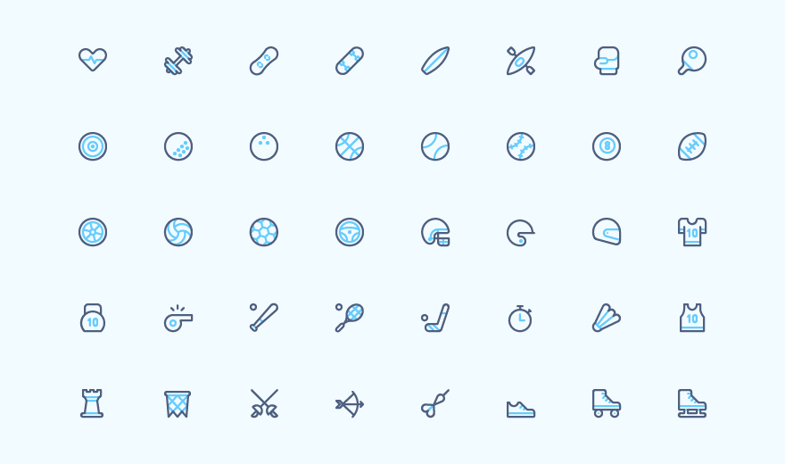 A free pack of sports icons. This set depicts icons of various sports, such as soccer, bowling, tennis, hockey, and many others. The icon set is created in a duo-color outline style. All icons are included in four formats: AI, SVG, PNG, and EPS. You can easily modify the size, stroke or color of any icon. You are allowed to use this free set for any personal or commercial use.