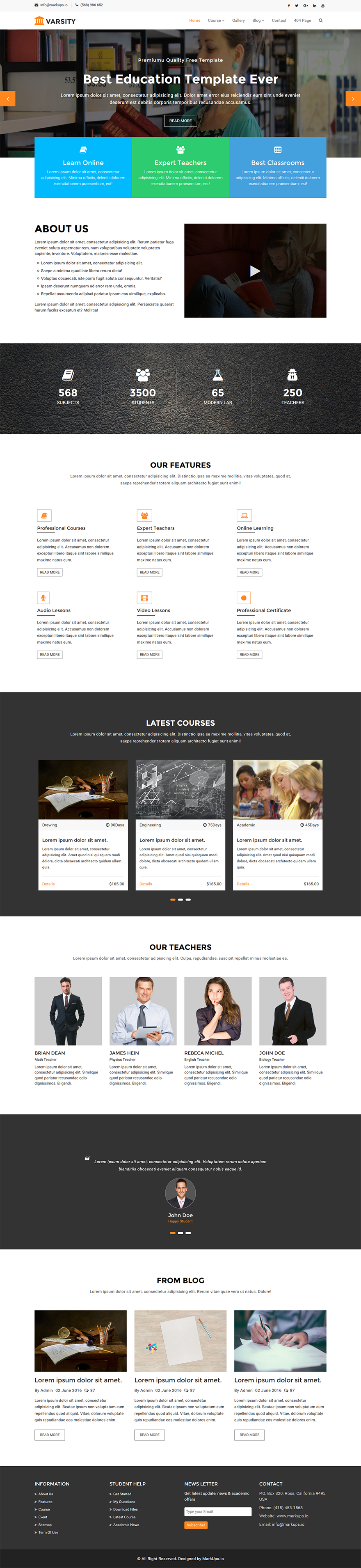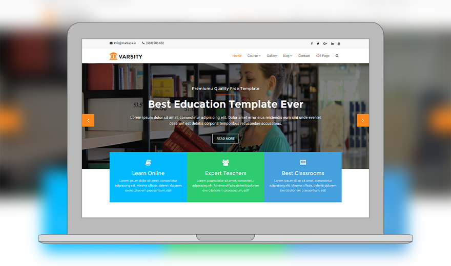 Free Education Website HTML Template - Varsity was designed for educational purposes. It can be used for universities, colleges, schools, coaching & other educational institute purposes. Varsity - free web template - was designed using Bootstrap framework which ensures about the responsive technology. Your website will look fully optimized for all kind of devices such as desktop, laptop, mobile & other various screen sizes.