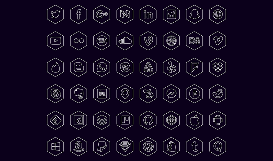 Check out this beautiful icon set consisting of 48 hexagon vector icons of multiple social networks and popular websites. This free icon set is designed in a single color outline style. It is available in two pre-defined versions - white and dark, but you're free to select any color for it as it comes in a vector format. You can also modify the size or stroke of any icon.