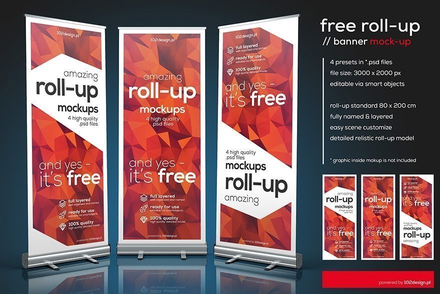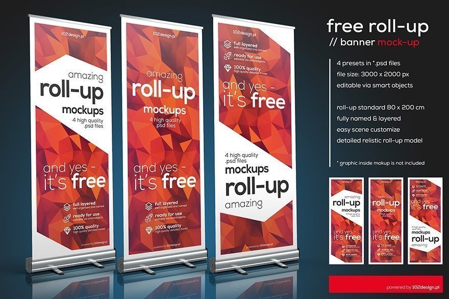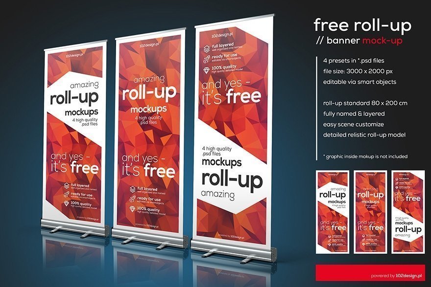 Download an absolutely free roll-up PSD mockup set. This free roll up banner design template is perfect for presentation of any of your advertising design. This free PSD roll-up banner mockup features different angles of view, fully editable scenes, and easily changeable background. It has properly named and organized layers. The size of Roll-up standard is 80 x 200 cm.