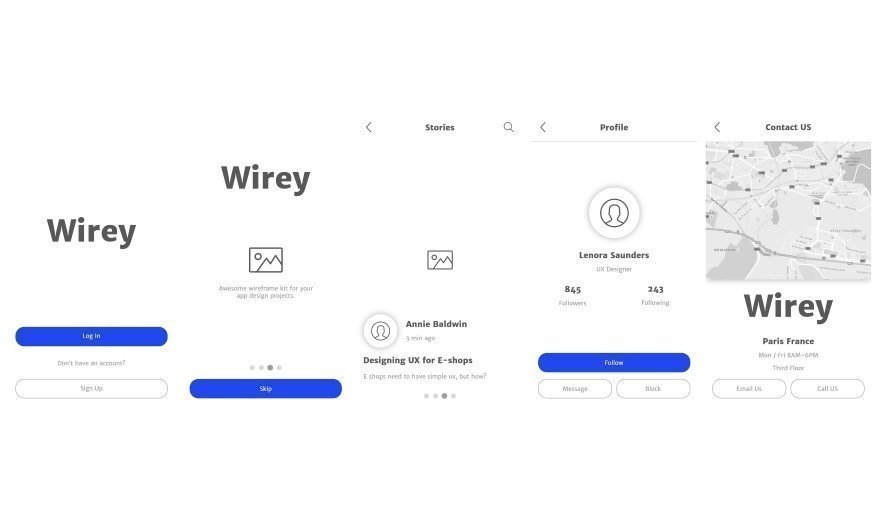 Here's a free sample of Wirey Mobile Wireframe Kit. This free wireframe kit is made with fast workflow in mind, so there are more than 200 ready to use screens included to the full version. This free sample contains 5 screens: login/sign up, walkthrough, profile, blog, and contacts. Super simple to use to boost your creativity and productivity. If you want, you can include images to create high fidelity prototypes.