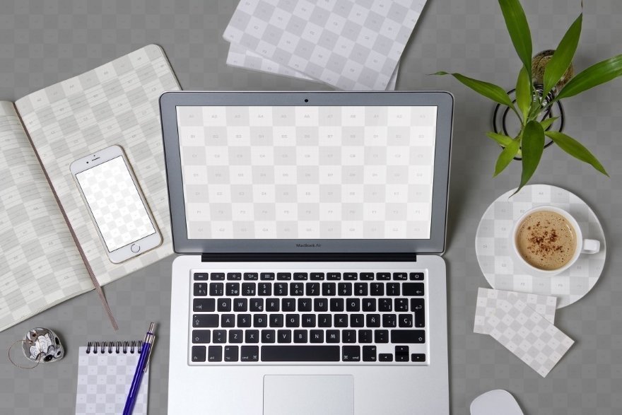 Download a free PSD mockup of the modern workspace with multiple customizable objects. This free PSD includes MacBook Air, iPhone 6, magazine cover, Moleskin, notebook, and business card mockups. The variety of the objects allows you to showcase different design projects in a modern way. You are able to adjust any of the mentioned objects in few clicks via Smart Objects feature. The reflections of this PSD mockup are optional with two variations: a classical flat gradient or a photorealistic blurry environment.